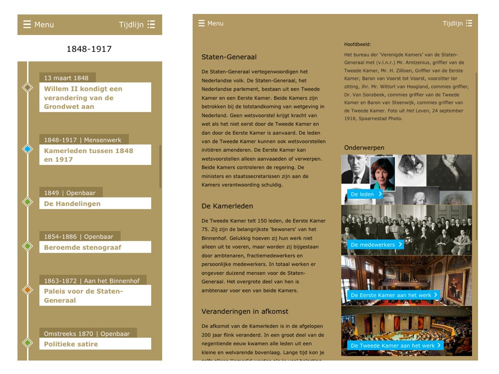 De app bevat achtergrondinformatie bij de expositie over de Staten-Generaal in het gebouw van de Tweede Kamer. De bezoekers kunnen vanuit de app een QR-code scannen op de zuilen van de expo, en zo meer info krijgen. Hiervoor werkten we samen met de tentoonstellingsontwerpers en -bouwers van Letter Z Design en Studio Überdutch. Daarnaast zaten we om de tafel met een team van schrijvers en de beeldredactie, om alles binnen de korte tijd goed en soepel op te leveren.